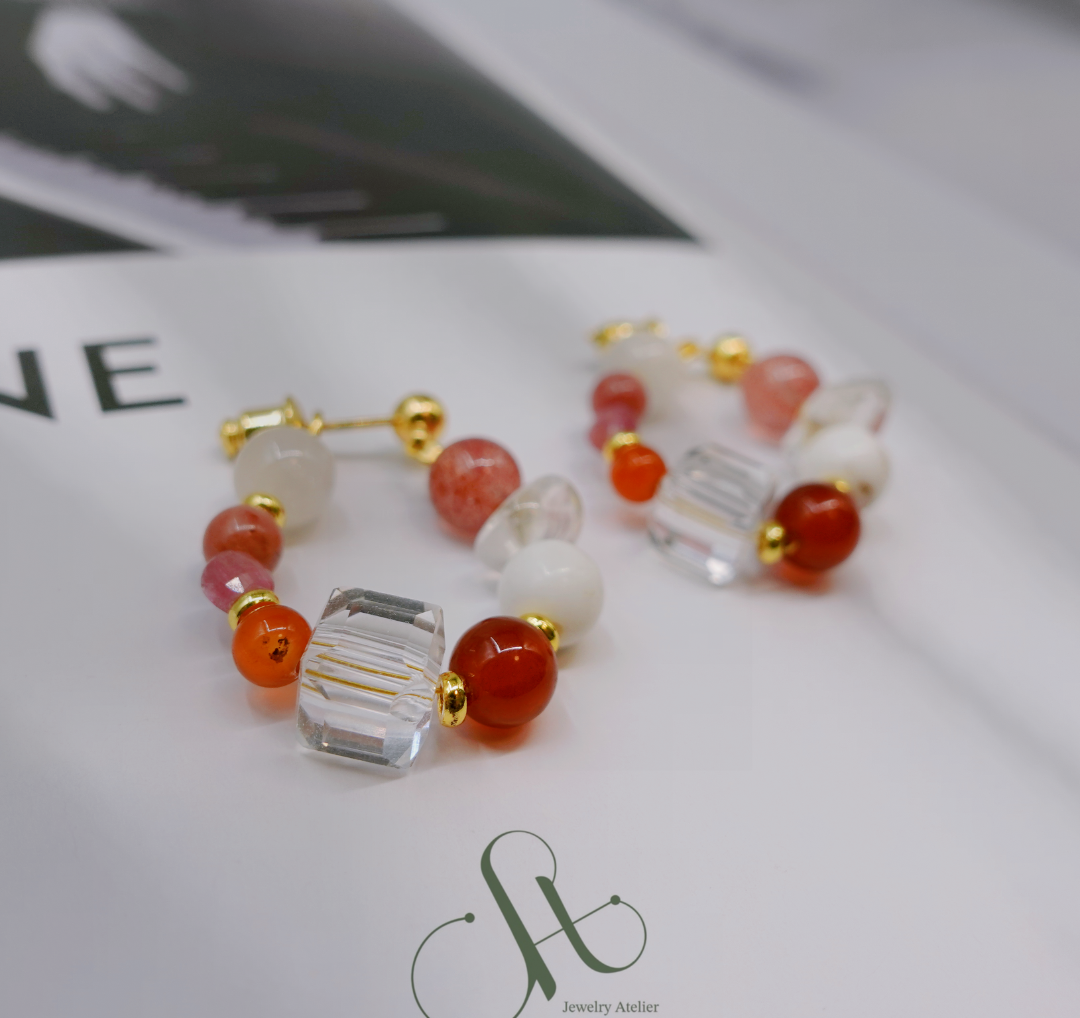 An exquisite mix of natural gemstones, these earrings resonate with the vibration of love, clarity, and grounded charm. A perfect companion for those seeking balance and heartfelt connection.