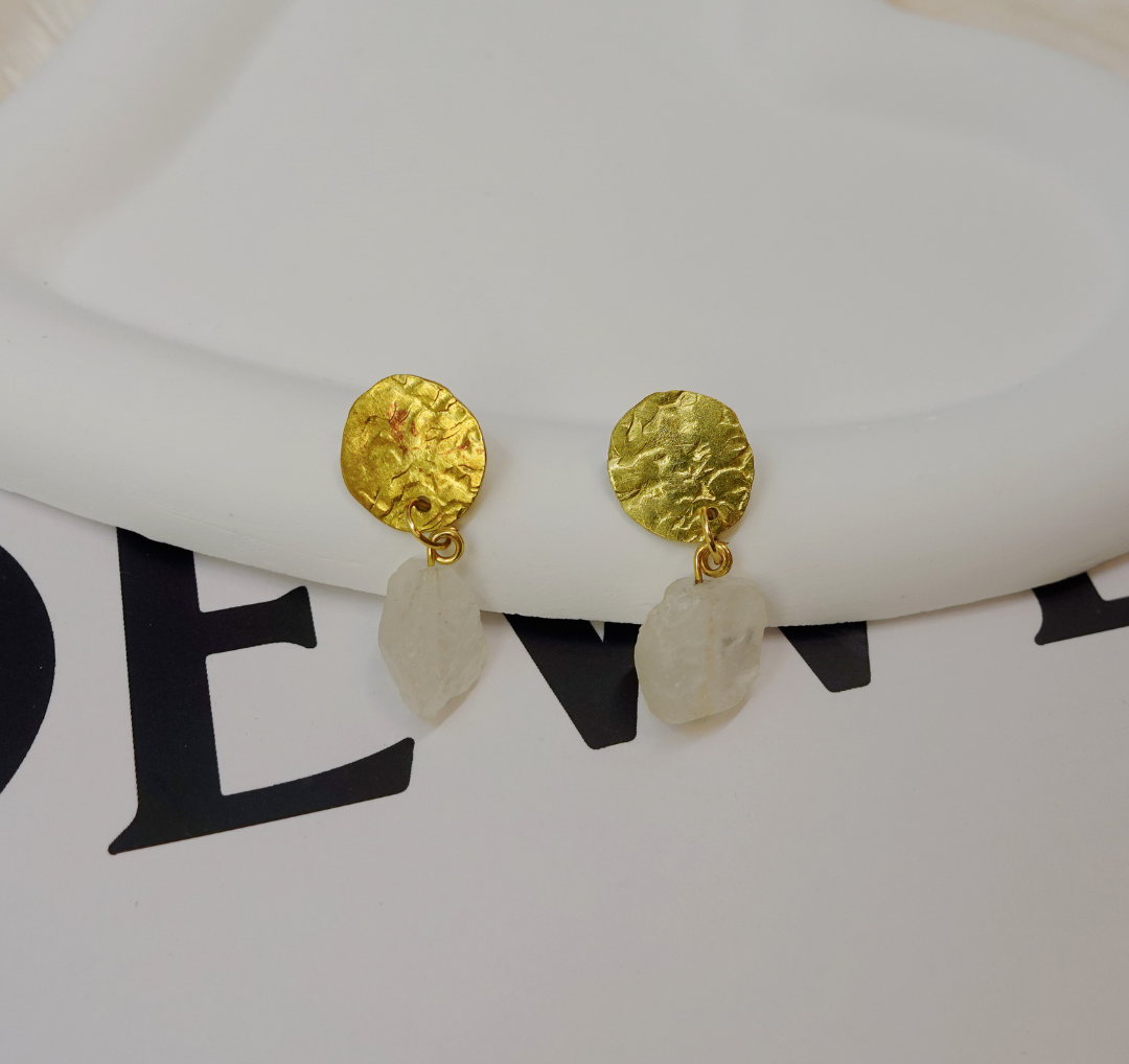 Crafted from natural free-form clear quartz and set in handmade brass with 18K gold plating, these minimalist earrings are perfect for both energy cleansing and daily elegance.