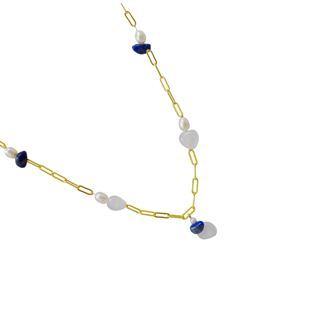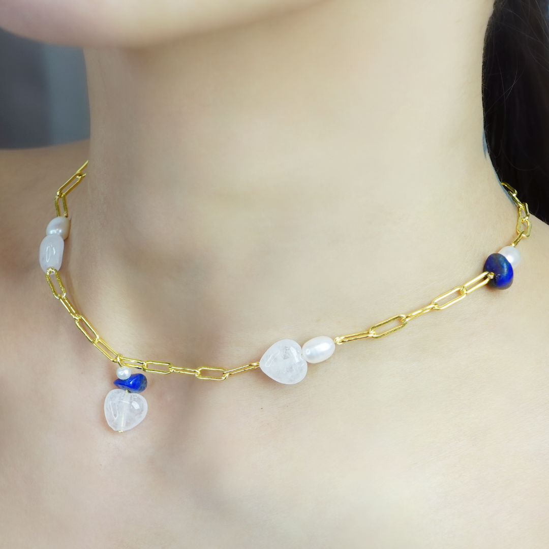 Natural lapis lazuli, natural pearl, clear quartz (heart), AKOYA pearl
