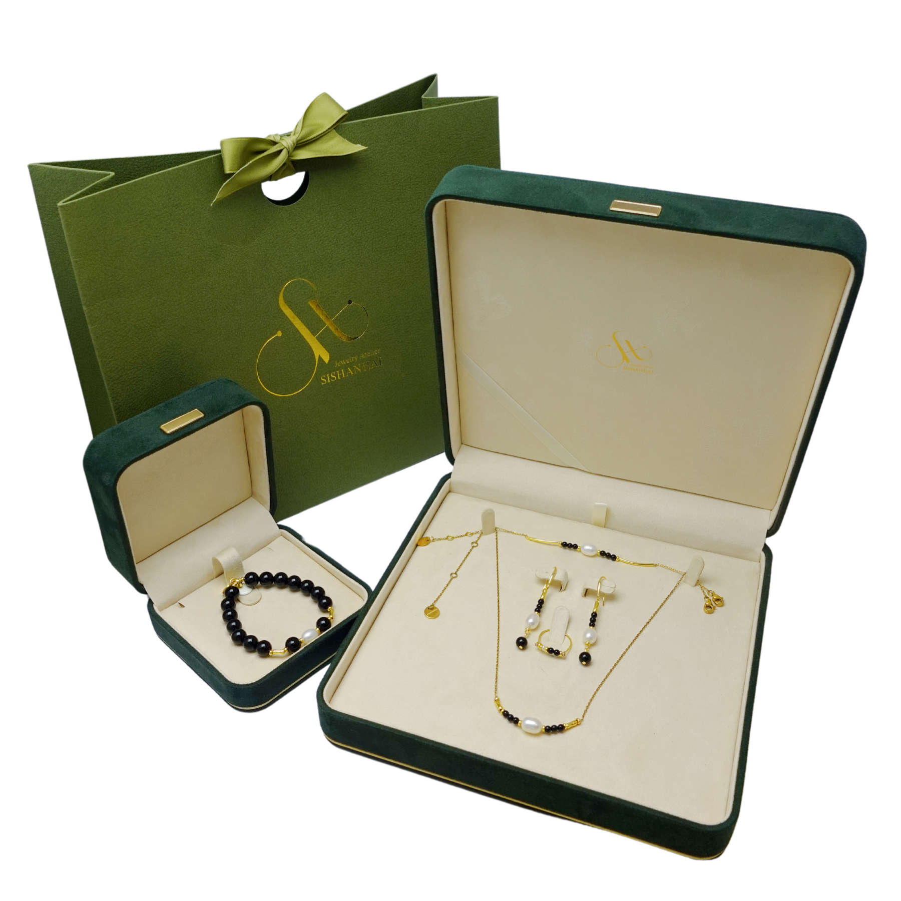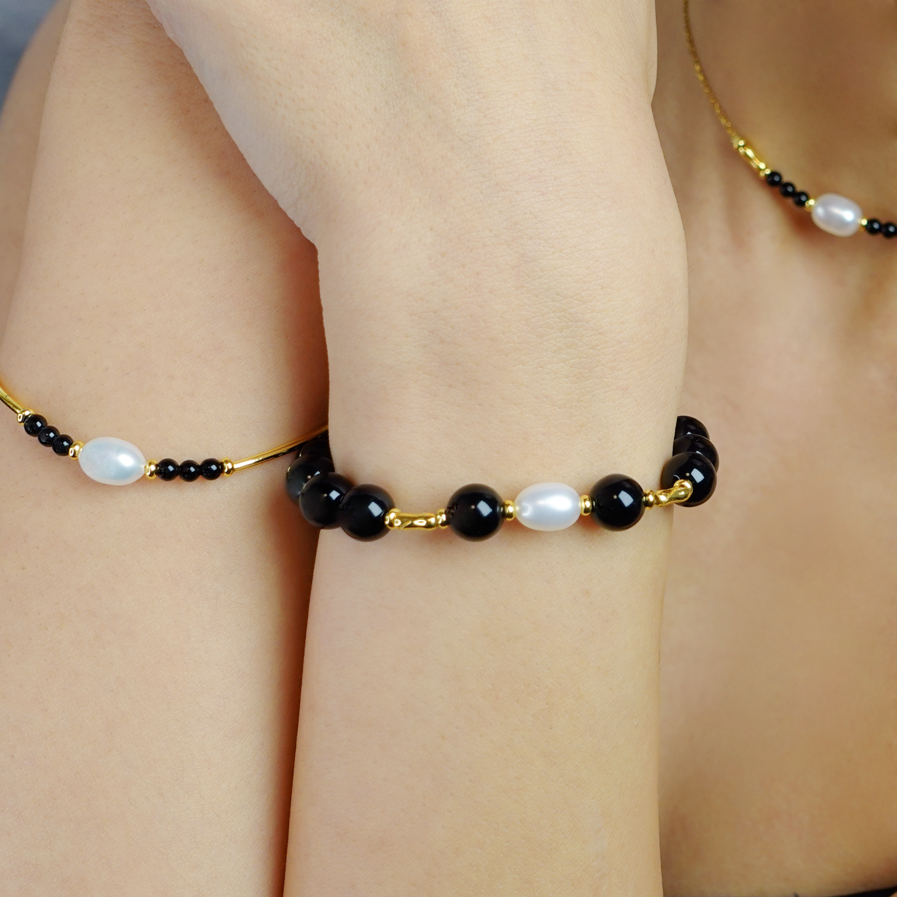 嚴選天然黑瑪瑙與強光天然珍珠,以柔中帶剛的設計風格,