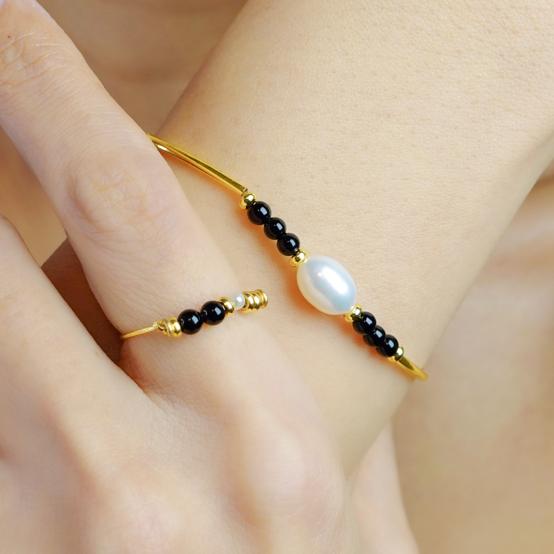 黑瑪瑙穩定氣場、隔絕干擾,強光米珠則帶來細緻柔光與靈性安撫,