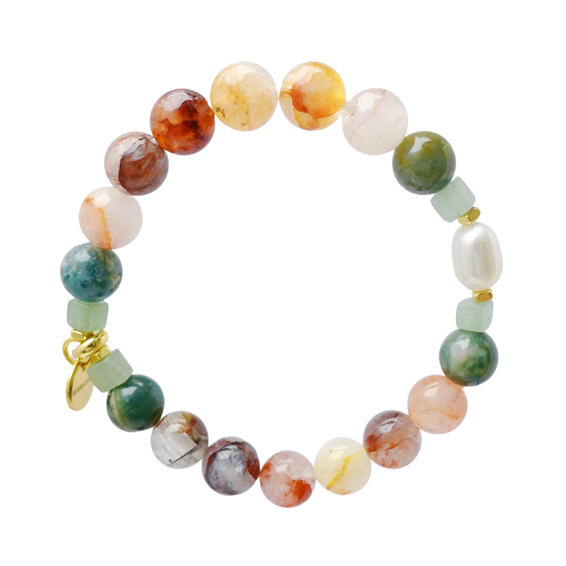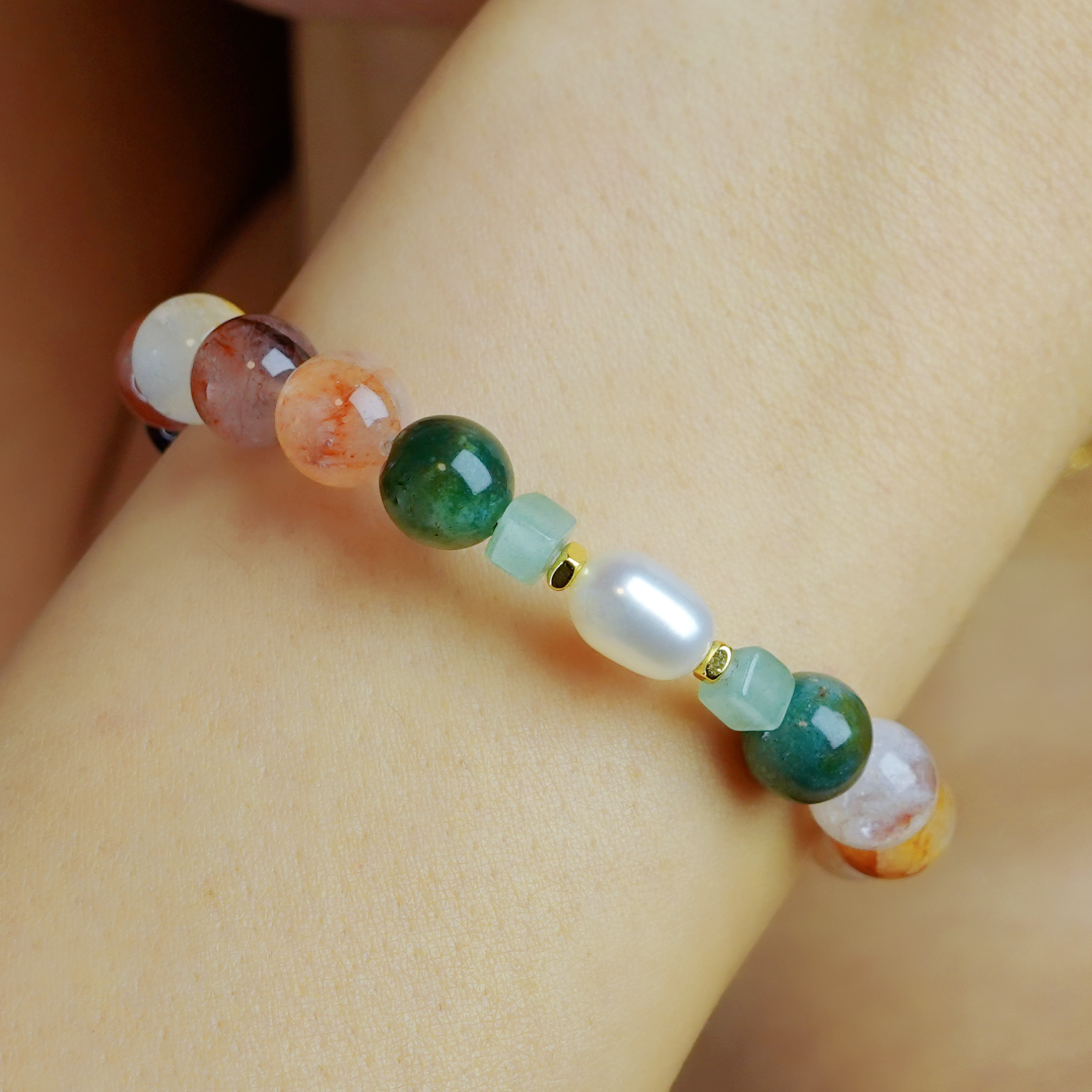 天然紅膠花水晶 、天然綠印度瑪瑙、天然綠東陵方形隔珠、天然珍珠、