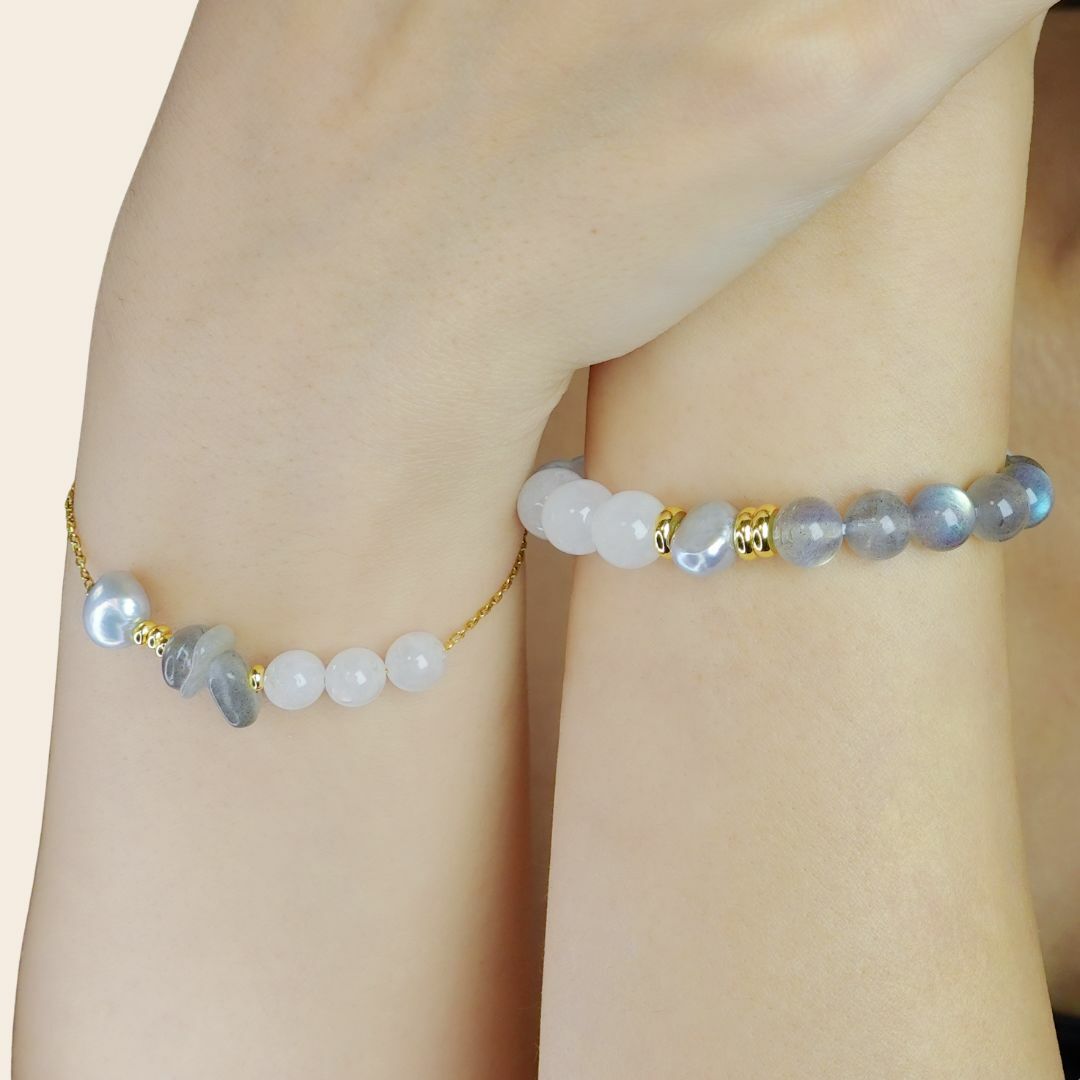嚴選天然白水晶、灰巴洛克珍珠、灰月光石與白閃光石,喚醒內在和諧、提升直覺力,
