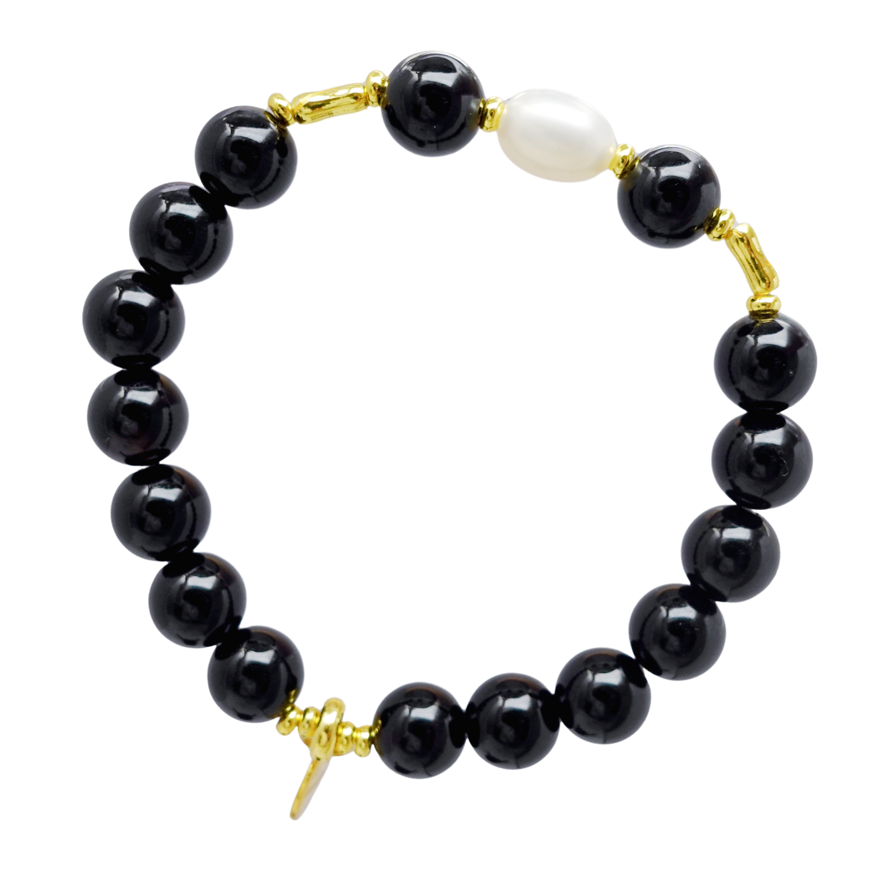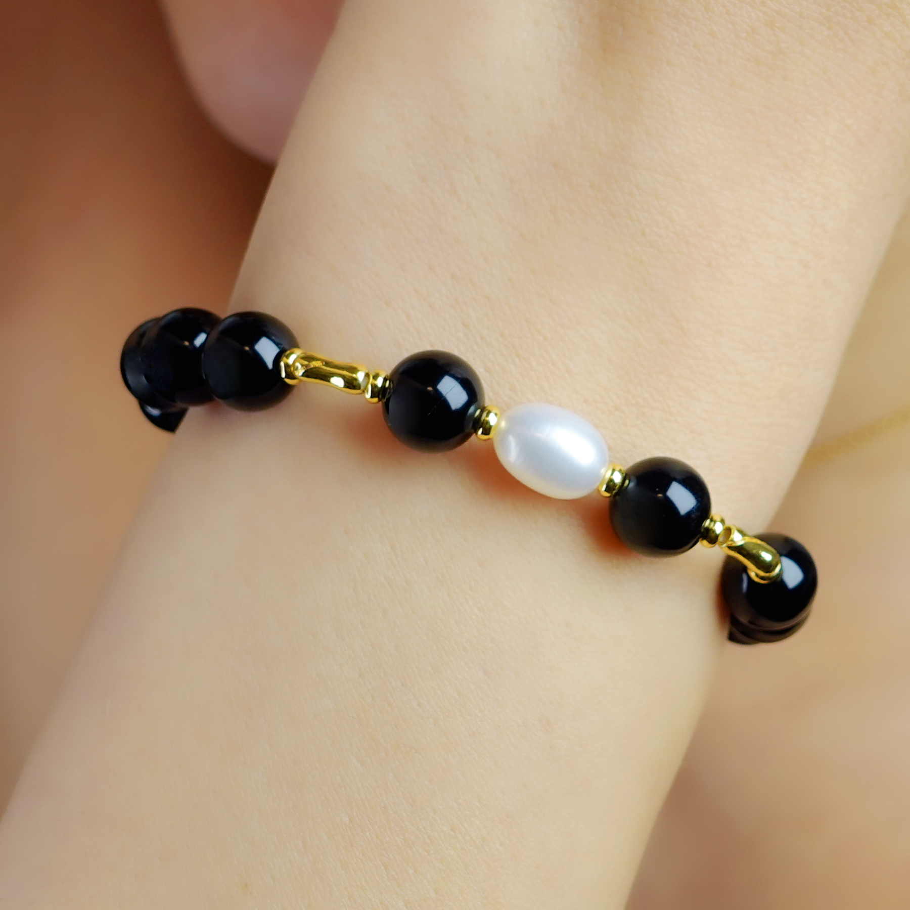 Black Agate provides a steady energetic core, while Pearl brings gentle healing energy.