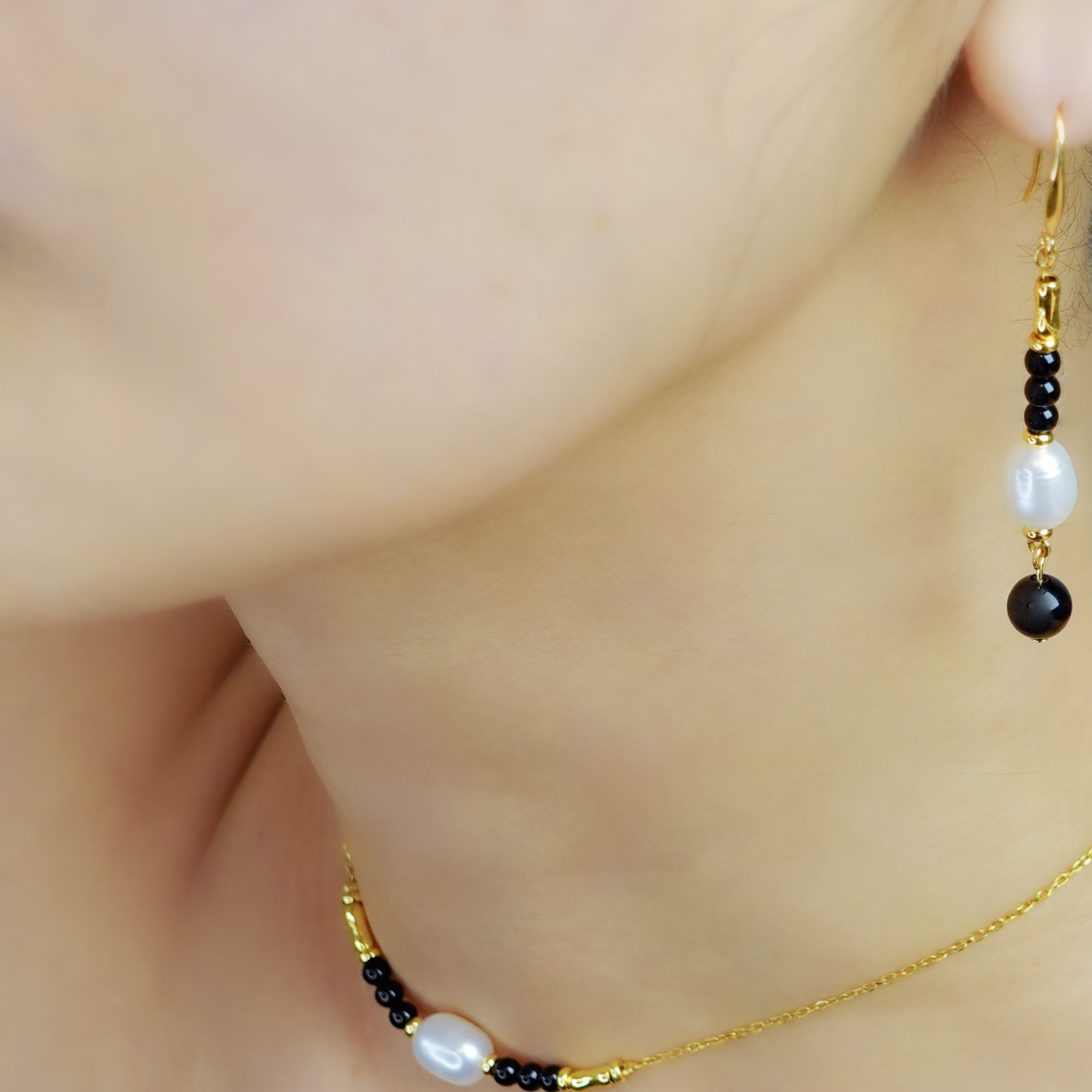 以黑瑪瑙為夜色核心,融合珍珠的溫潤與靈性光感,