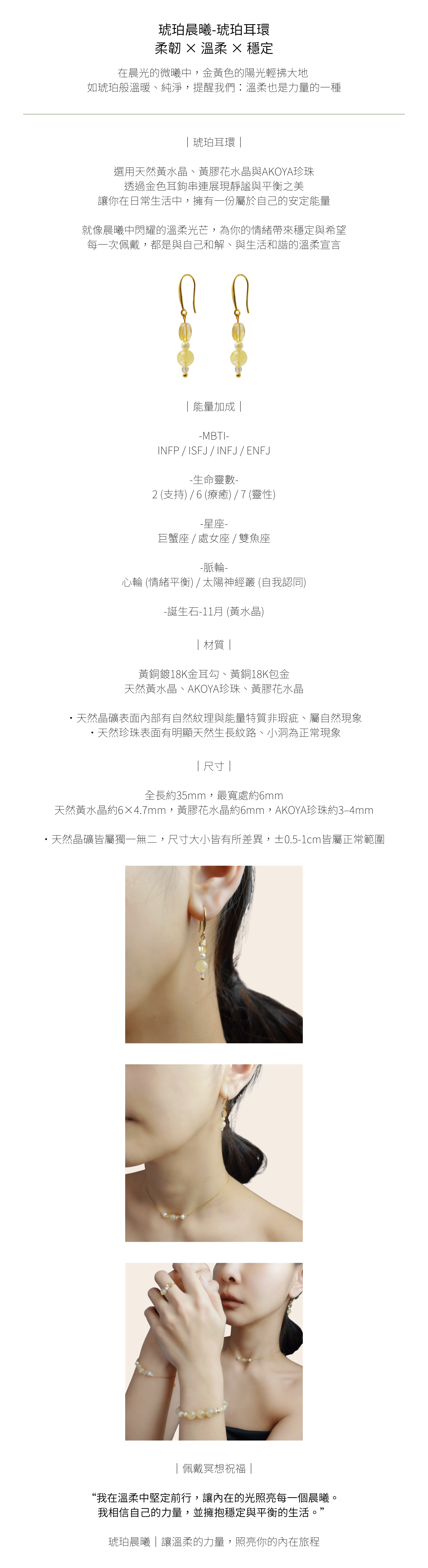 琥珀耳環 | Amber Dawn Earrings - 柔韌 × 溫柔 × 穩定 天然黃水晶 – 帶來希望與積極思維,提升內在韌性與信心。 AKOYA珍珠 – 散發高雅氣質,安撫情緒,帶來平靜與平衡。 黃膠花水晶 – 溫潤溫柔,為能量場注入清晰與支持。