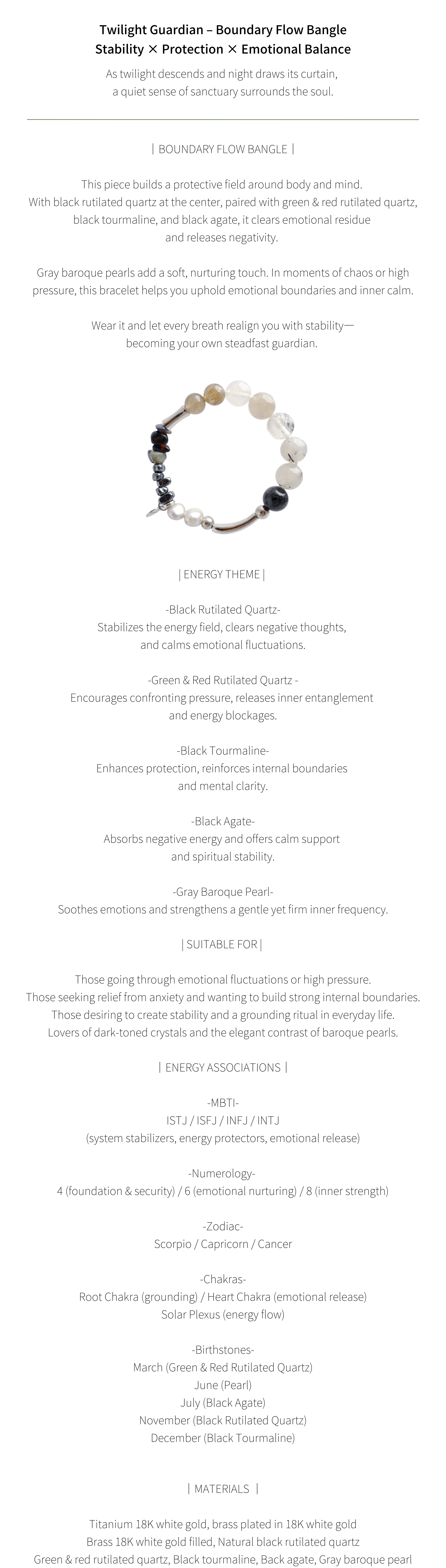 This grounding combination supports emotional stability and protection. Black Rutilated Quartz clears negativity, while Green & Red Rutilated Quartz and Black Tourmaline reinforce strength and clarity. Black Agate and Grey Pearl soothe and stabilize with quiet elegance.