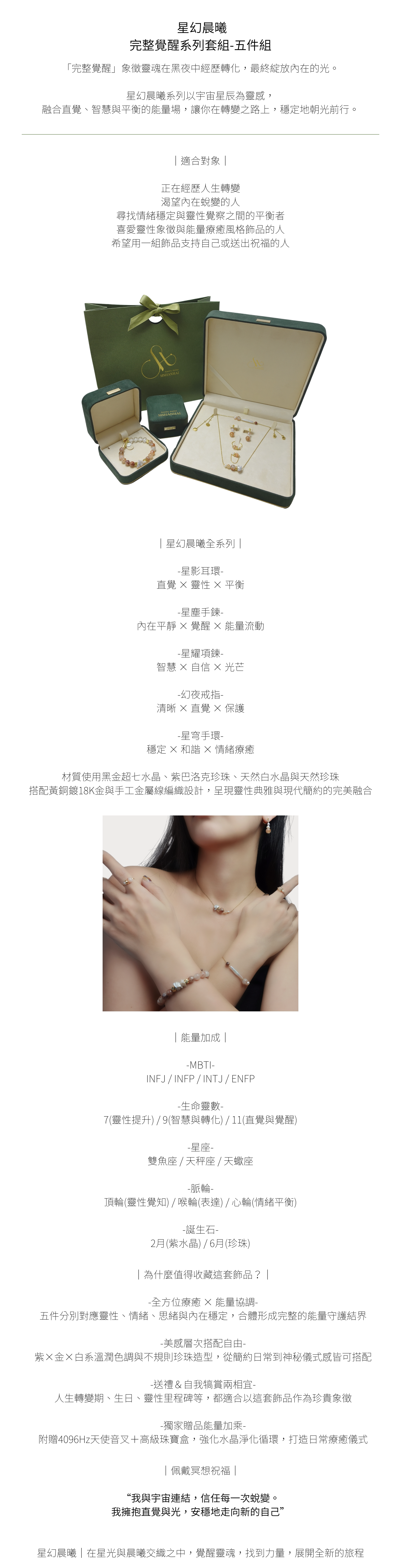 這是一組為靈性轉化與情緒平衡而生的能量飾品全套組合。內含星幻晨曦系列五款經典作品:星影耳環、星塵手鍊、星耀項鍊、幻夜戒指與星穹手環,完整涵蓋直覺、平衡、情緒療癒與靈性覺醒的能量核心。巴洛克紫珍珠、黑金超七水晶與天然淨透水晶交織,如同夜空星辰與晨曦之光,映照你蛻變中的光芒。無論正在經歷人生轉變、自我探索或靈性成長的旅程,這組飾品將成為陪伴你前行的靈性祝福。
