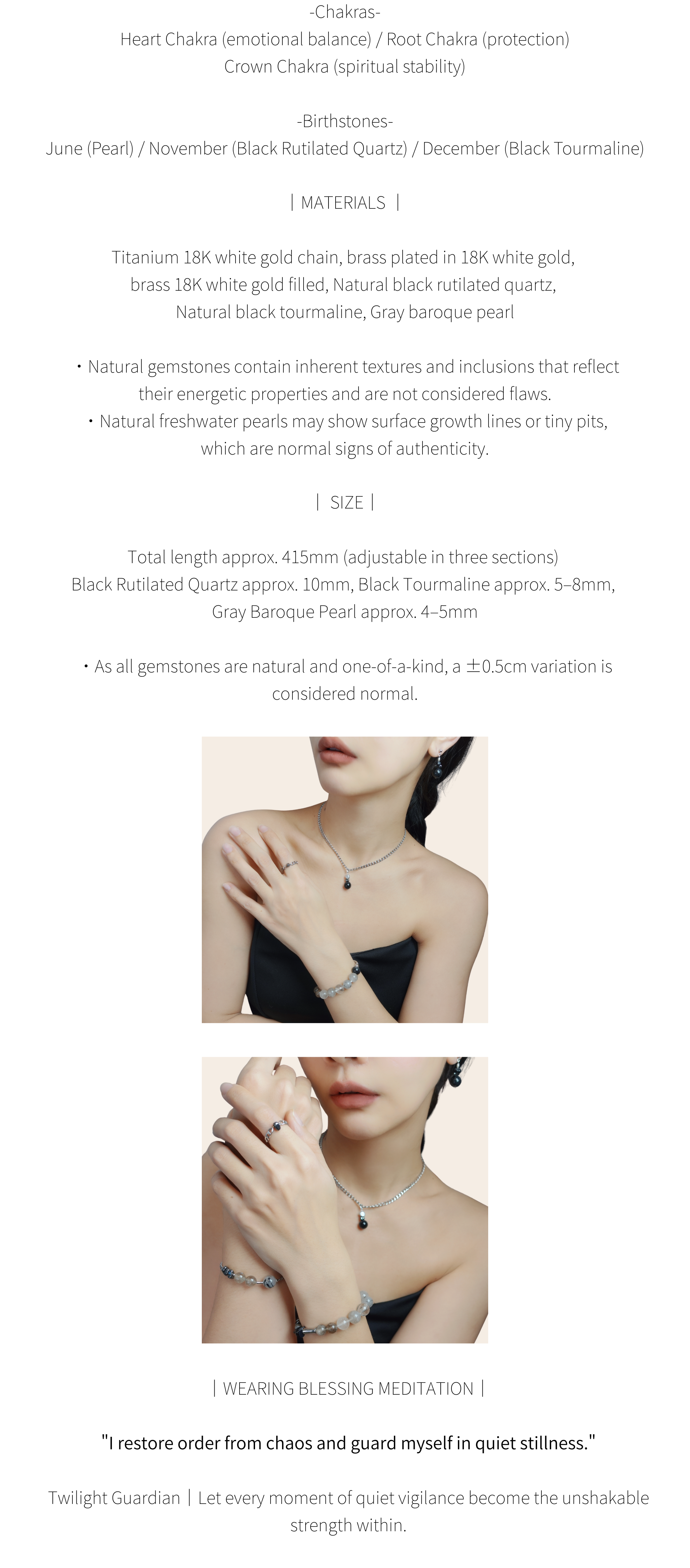 Heartward Clarity Necklace blends Black Rutilated Quartz, Black Tourmaline, and Grey Pearl to support inner stillness, emotional protection, and reflective calm. Ideal for those navigating transitions, seeking balance, and embracing mindful daily rituals.