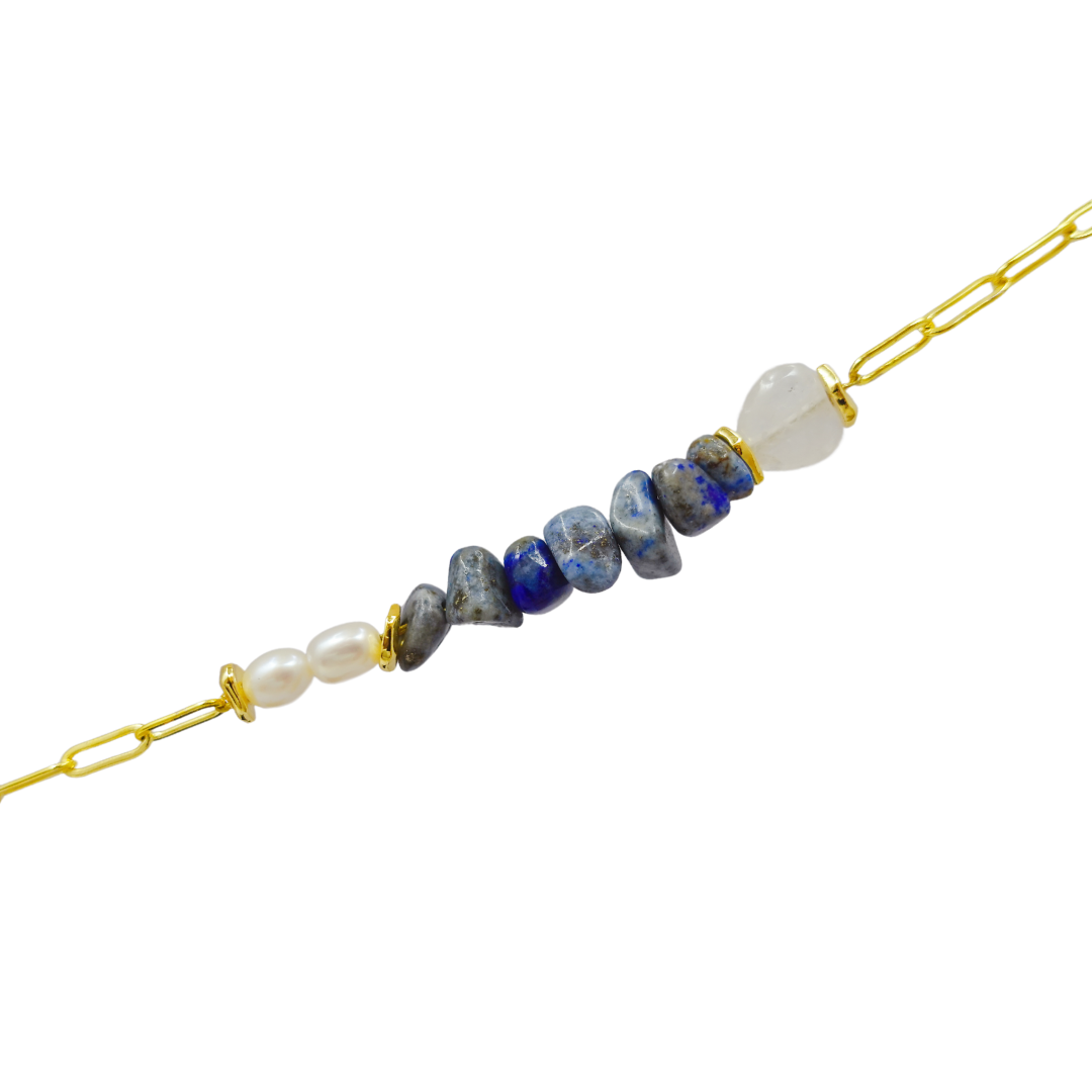 This bracelet features lapis lazuli chips as the central stone,