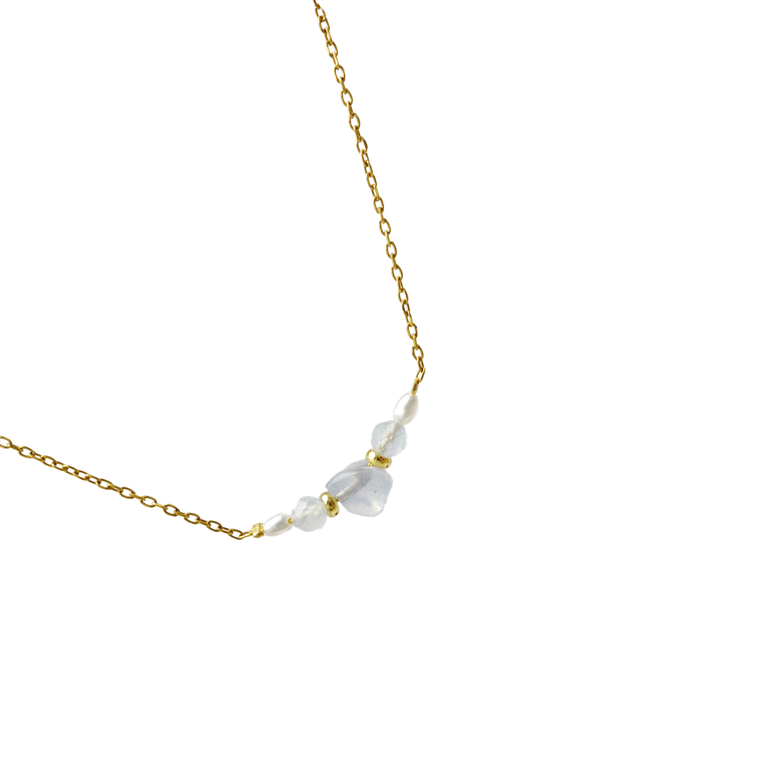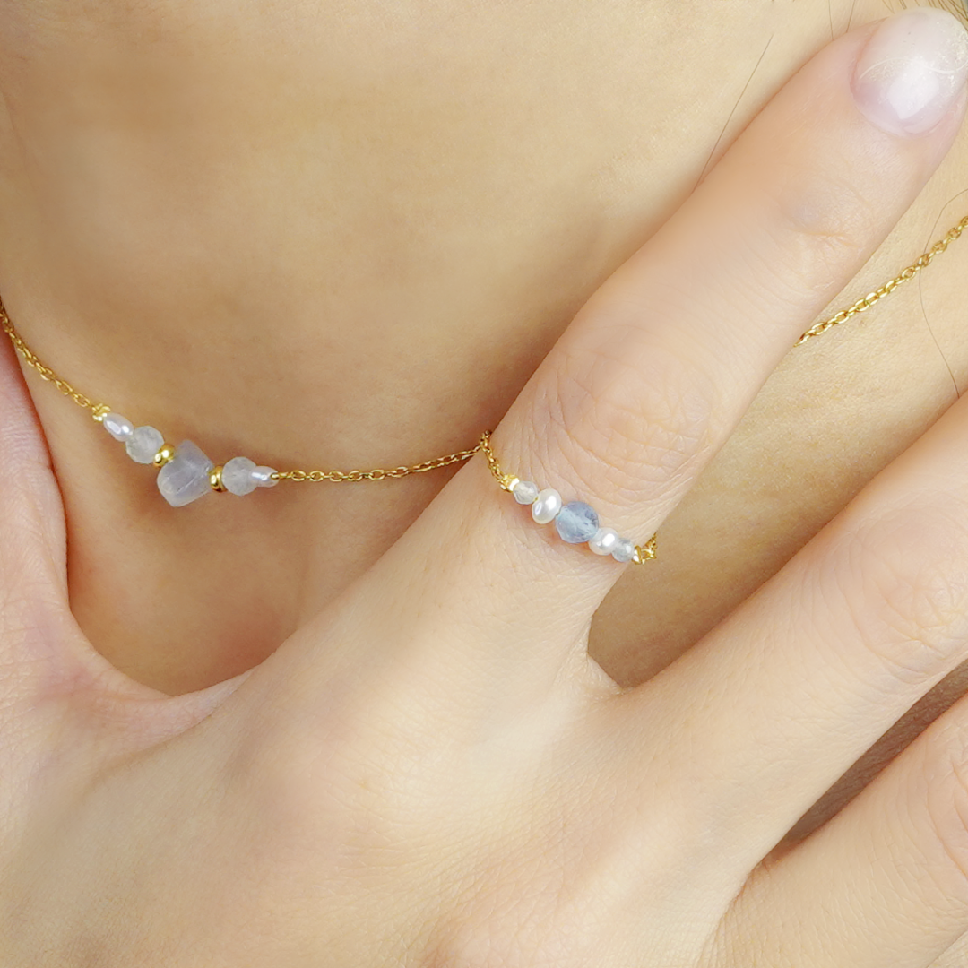 This collection blends the clarity of aquamarine with the resilient softness of pearls,