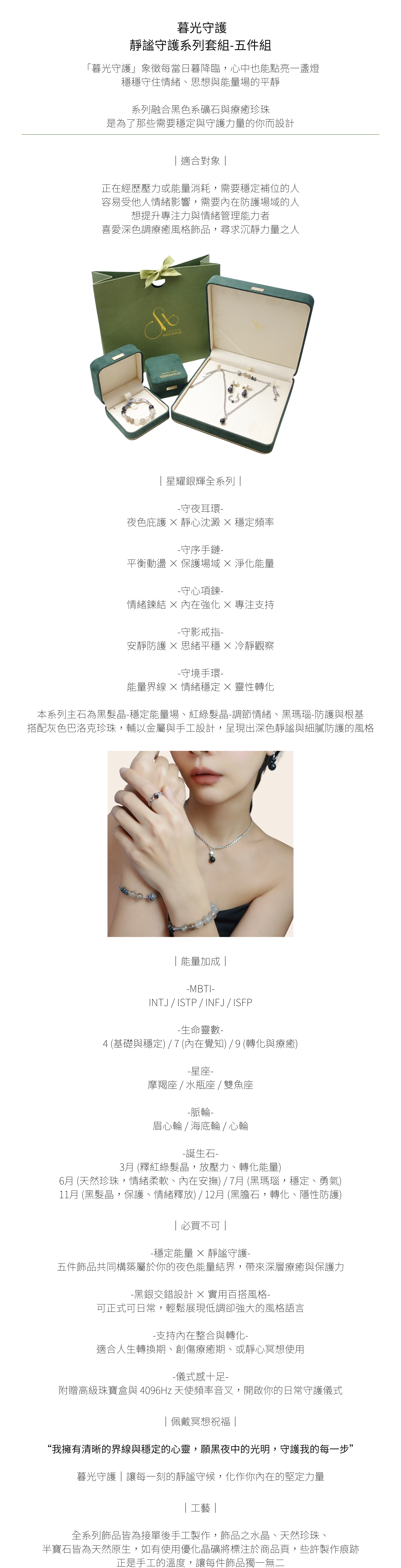 這是一組為「穩定 × 靜謐 × 防護」而設計的暮光能量套組。內含暮光守護系列五款設計作品: