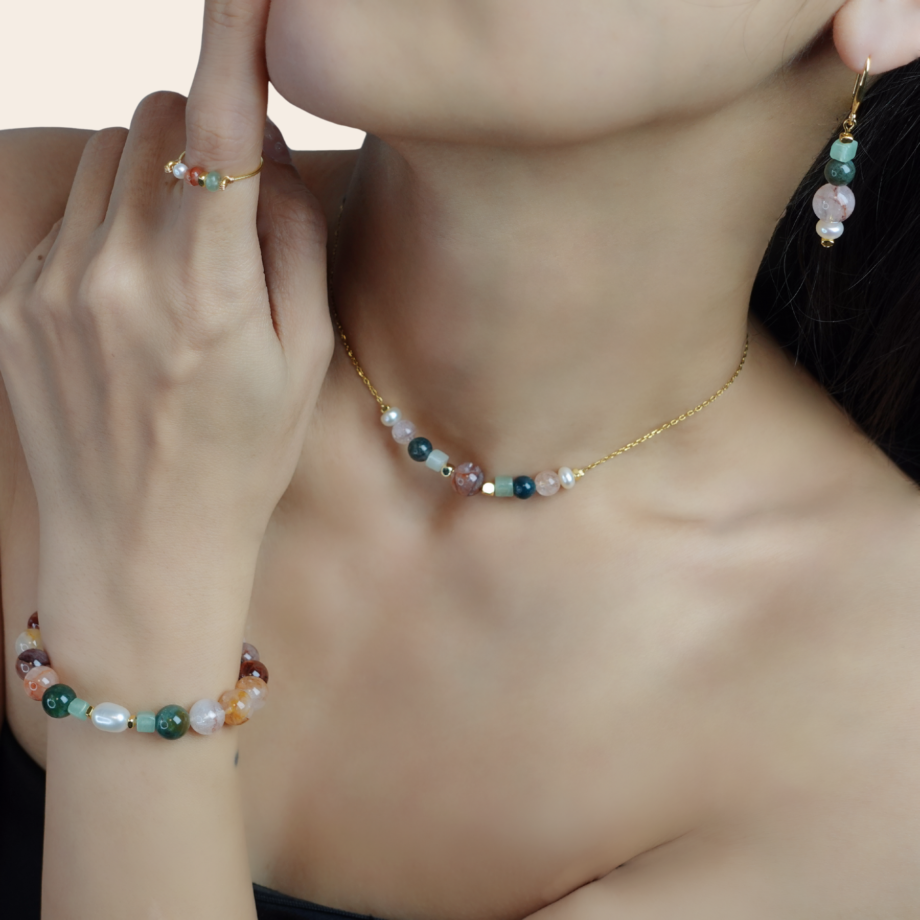 Red Cherry Blossom Quartz × Green Indian Agate × Green Aventurine × Natural Pearl