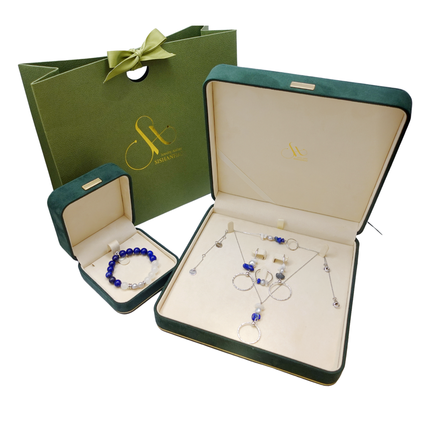 內含《銀藍幻境 Silver Blue Mirage》系列五款代表作: 星霧耳環、藍霜手鍊、銀芒項鍊、靈曜戒指(經典/鍊戒)、星澈手環。