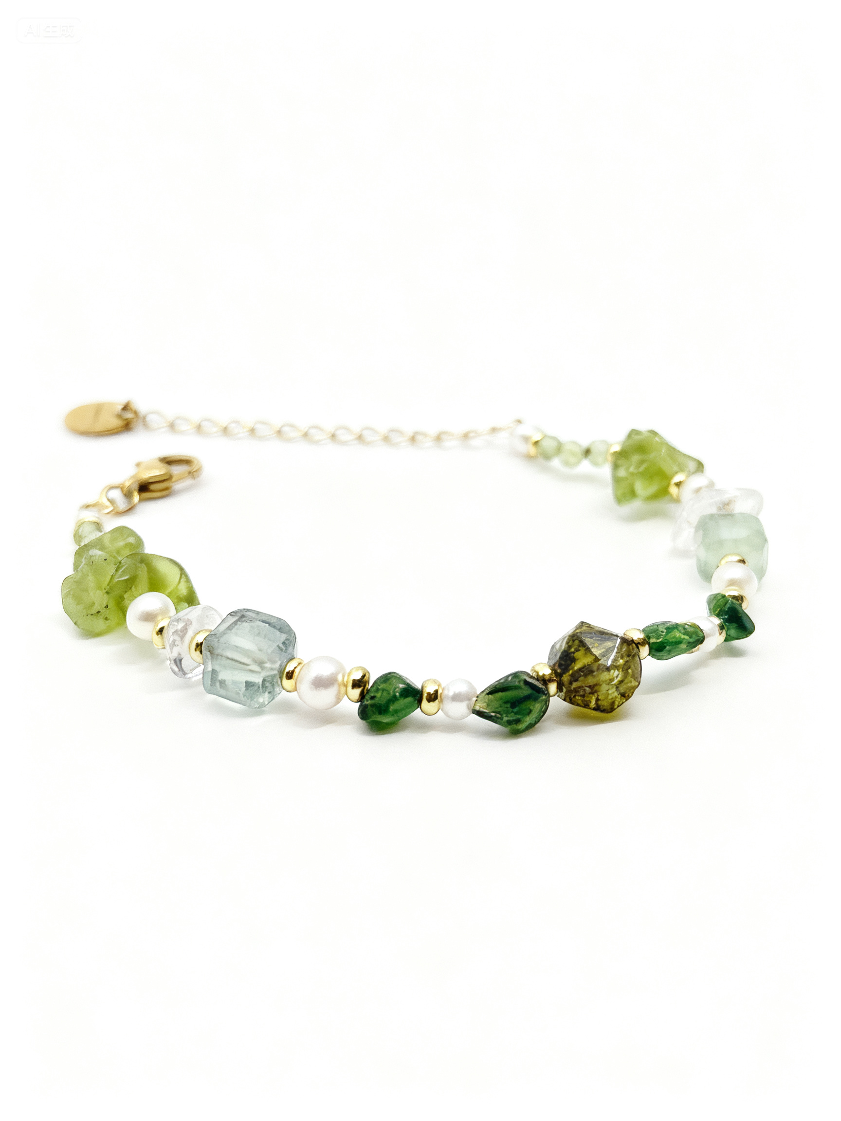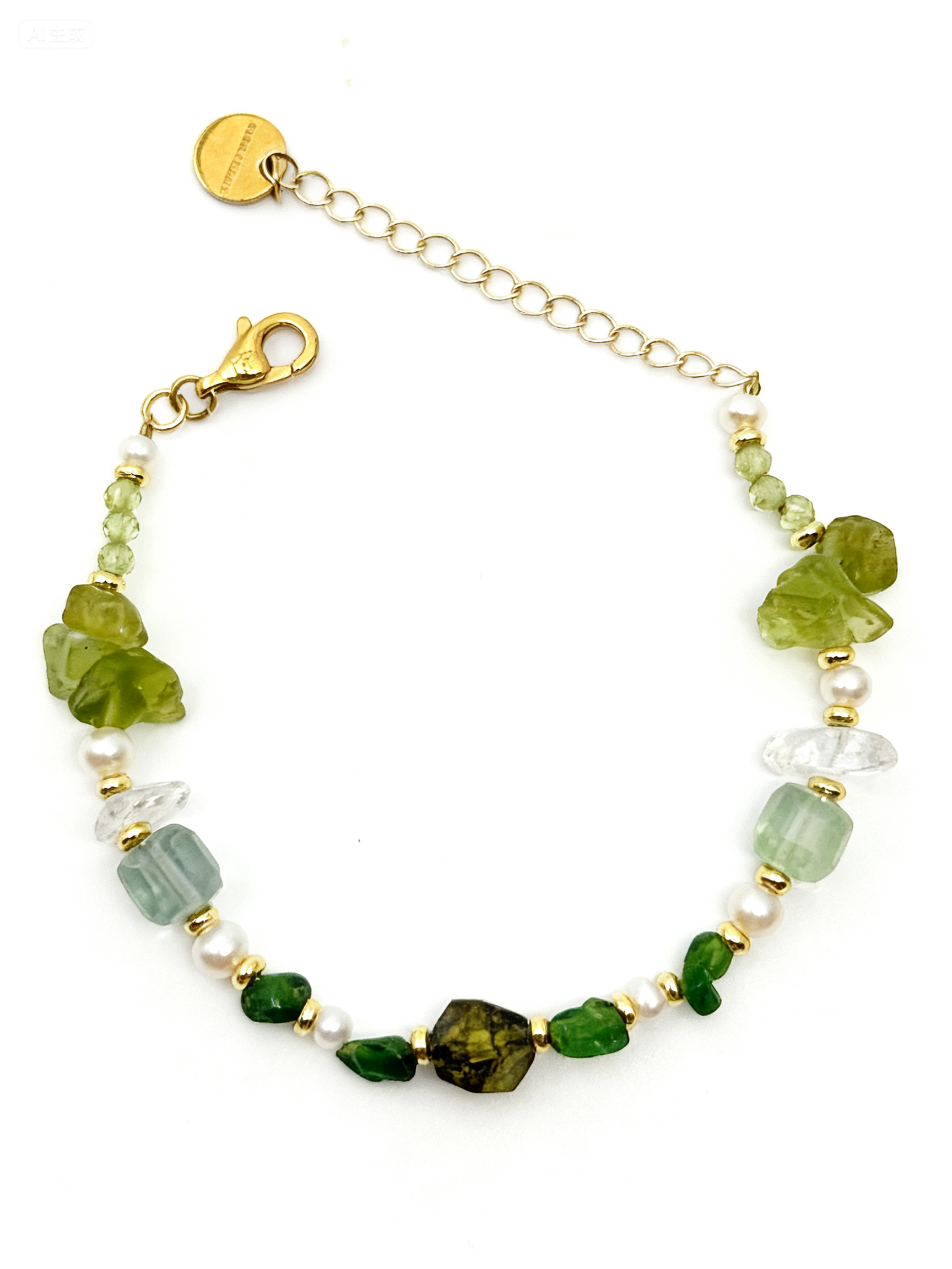 Materials: Pearl 3mm, White Quartz (freeform), Green Fluorite (freeform), Optimized Green Peridot, Green Fluorite 6mm, Green Peridot 3mm