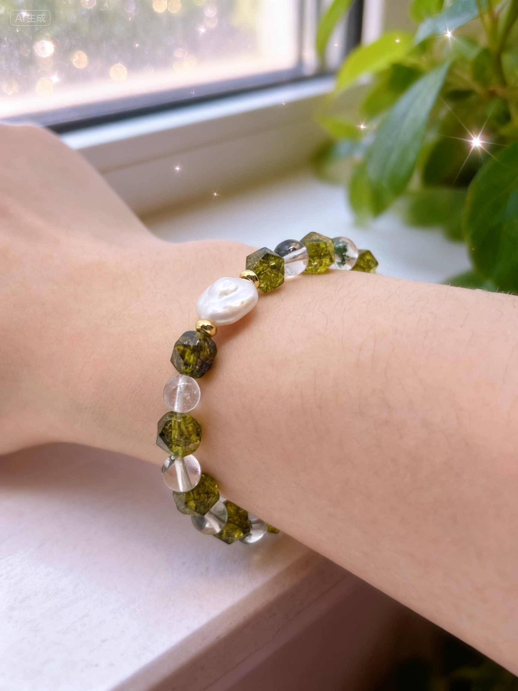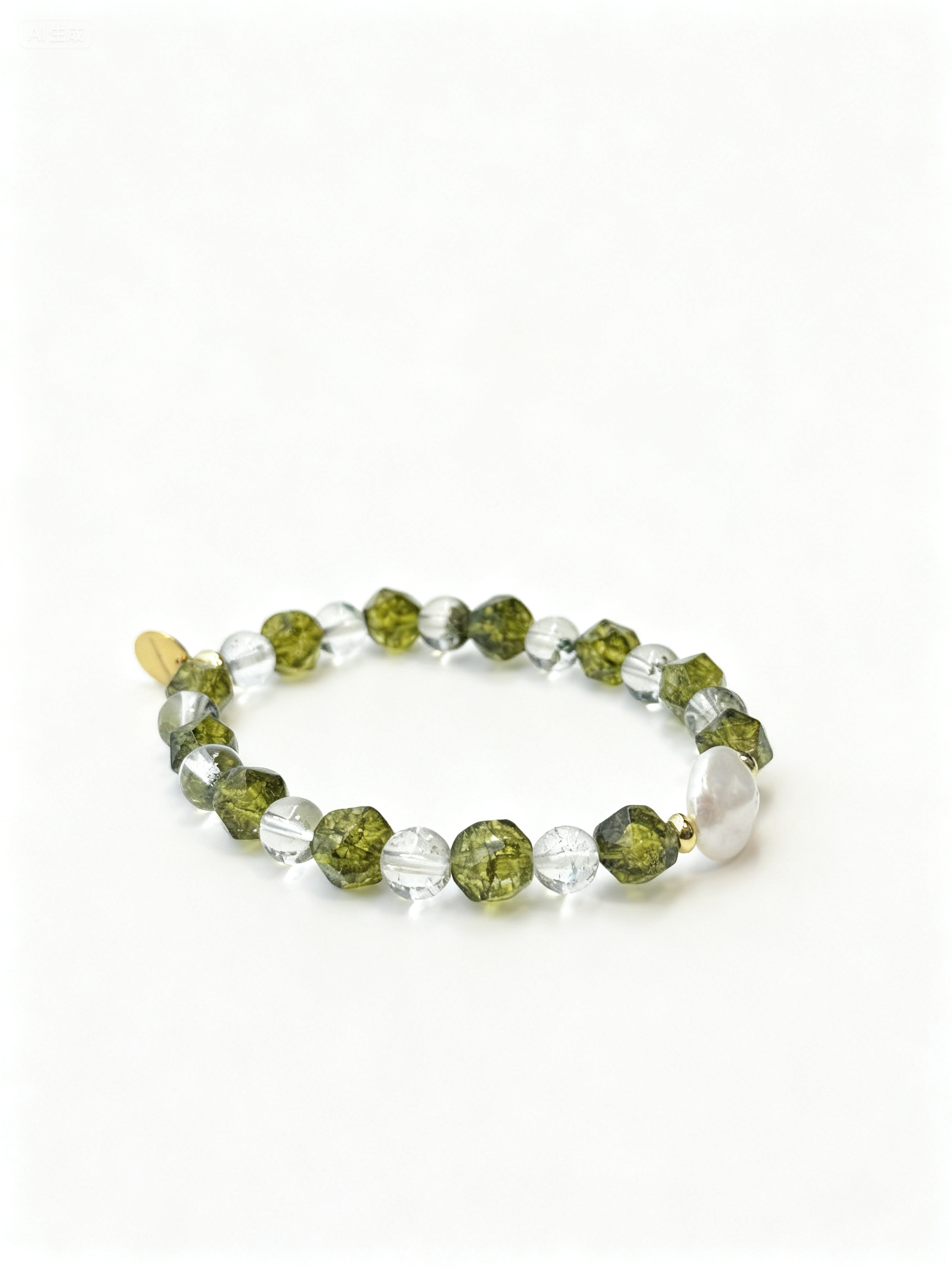 Peridot × Green Phantom Quartz × Baroque Pearl; Japanese elastic cord; 18K gold-plated / titanium steel (skin-friendly, easy care)