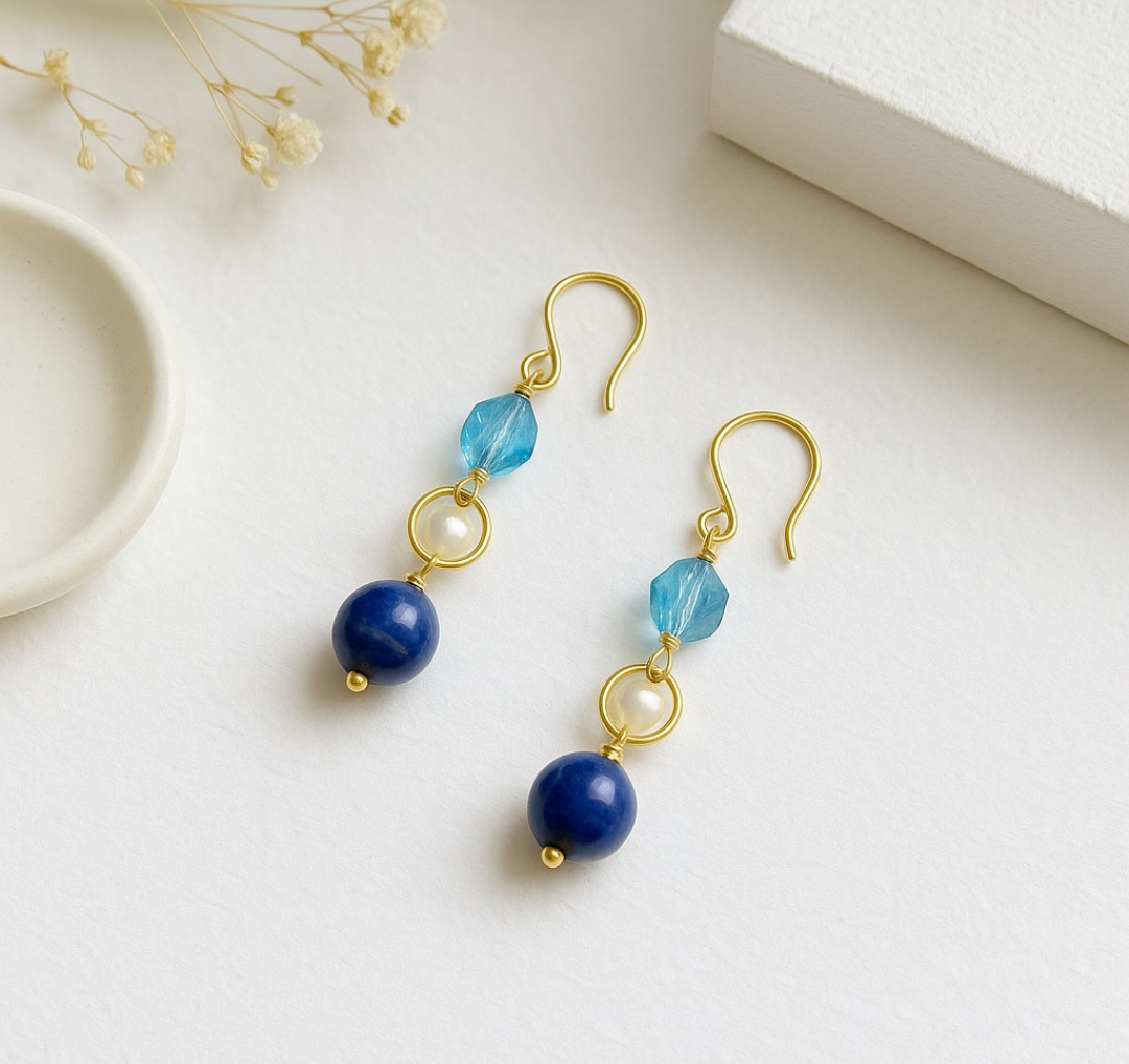 融合優化藍晶石、天然藍晶石與天然珍珠,這款耳環設計柔美中蘊含堅定力量,幫助你清晰表達,穩定思緒,找回內在節奏。